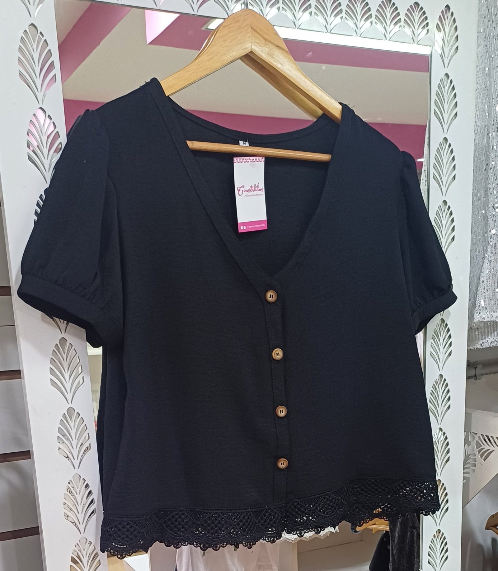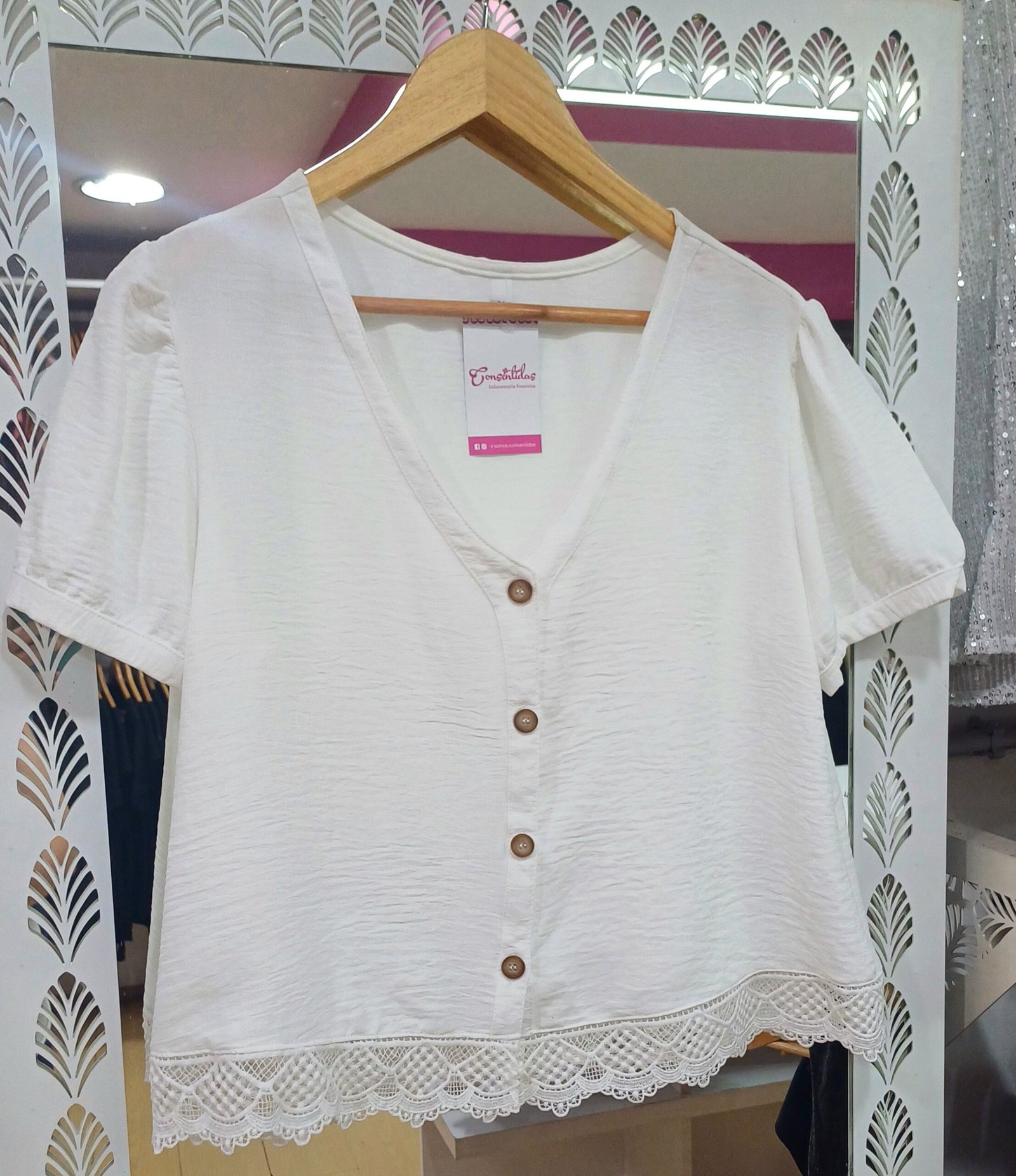 Los botoncitos de madera al frente le dan ese aire de camisita canchera, y el detalle de broderie en la parte inferior suma un toque delicado que levanta todo el look.
