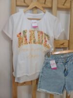 “Tu nueva remerita favorita está aquí: algodón suave, tajitos laterales y una estampa llena de color. Básica pero con onda, perfecta para usar todos los días.”