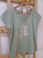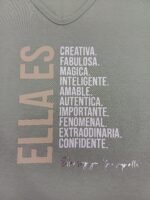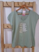 Suave, fresca y canchera. Con escote en V favorecedor, frase motivadora que inspira y un color verde oliva súper combinable. De manga corta, ideal para todos los días, con un toque positivo. ✨